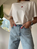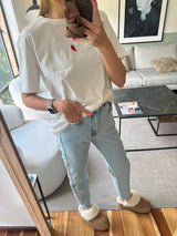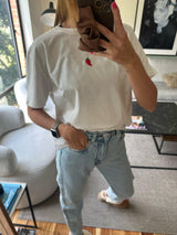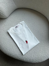 La camiseta esté hecha en algodón 100% y el aplique de ají en hilo 100%